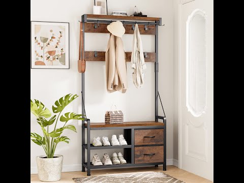 - 【Movable Hooks】Our coat rack with bench and shoe storage includes 17 hanging hooks, 2 shelves and 2 drawers. All the hooks on our hall tree is movable, and you could adjust them to any position you like for organizing various clothes, caps, bags and etc..